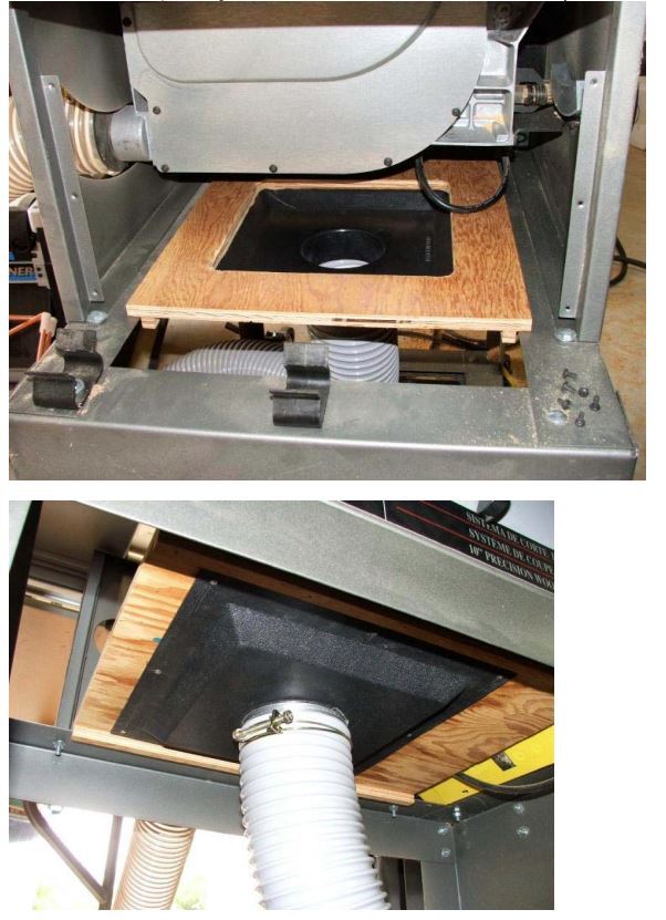 It seems to work effectively very simple DC belly pan under BT3000. Not tightly fitting I wanted to allow air in to carry the dust to the DC, pulling on a closed cabinet is not a good idea. So the plywood sits on the stand, not screwed down or anything. So there's air coming in thru the ends and the Shroud dust port arc. This is an actual picture after use, not cleaned up. The DC is connected with two 4-inch hoses to the shroud and the belly pan. The biggest issue is if I don't use a ZCTP the thin, long cutoffs get sucked in and end up in the Shroud hose jamming it up.