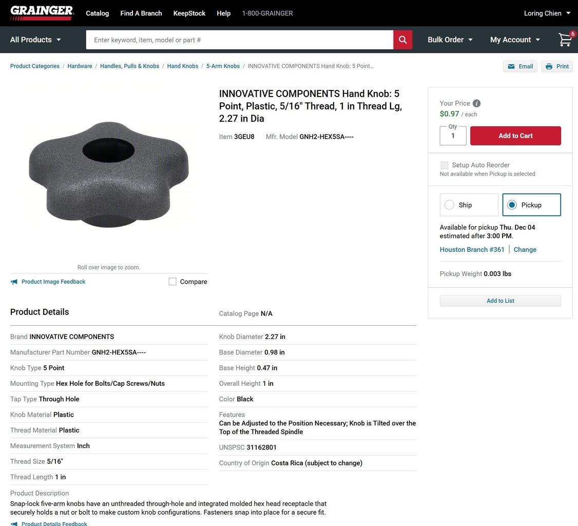 Knob is 97 cents at Graingers, I put three on will Call COD and picked up at my local Graingers. I think Ace Hardware has them for $4 or 5.