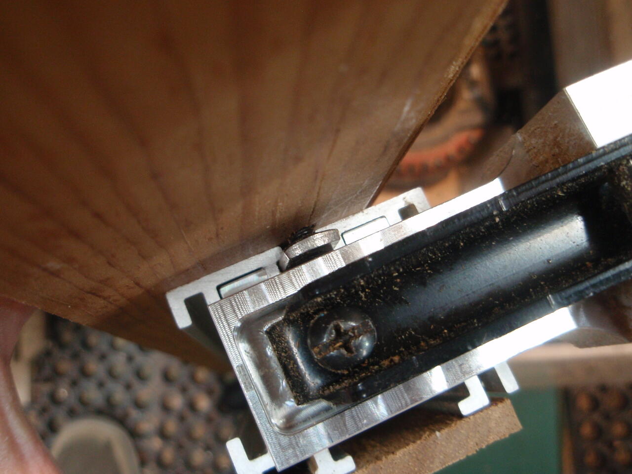 End-on view of T-nut entering rip fence; note I have one of the metal roller holder replacing the original roller holder. I found it was easiest to take the rip fence off the saw to install the T-nut rather than install in position where you were kind of blindly feeling for the slot.