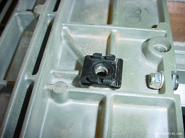 Since the nuts are nylock self locking just snug until barely tight. I have found that if left at just snug you can turn the screws with a nut driver from the top of the table. In this condition your SMT may need re-adjustment slightly more often although I've not really noticed as before each large project I check SMT alignment and adjust if necessary. For reassembly leave them in this slightly loose condition and turn all of them so that they are at their farthest out adjustment. Carefully slide the SMT table back onto the base, verify all four captue the base as in the following pic/ drawing.