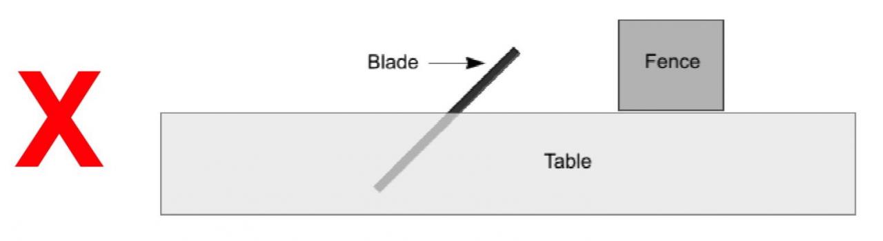 Never tilt the blade so that the workpiece is trapped in the angle between the blade and the fence. This is a condition that has a very high potential of causing kickback: