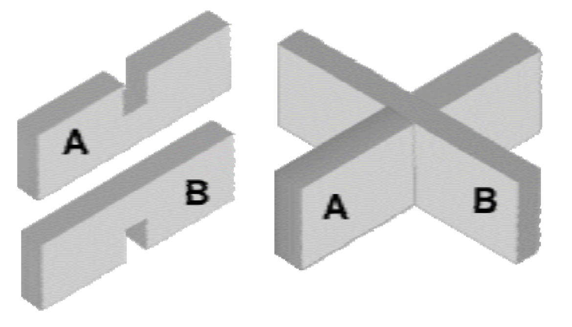 Rib “A” is notched halfway through, as is Rib “B” - the width of the notch equal to the thickness of the material. They can then interlock, as shown, when “B” is lowered over “A” at right angles.