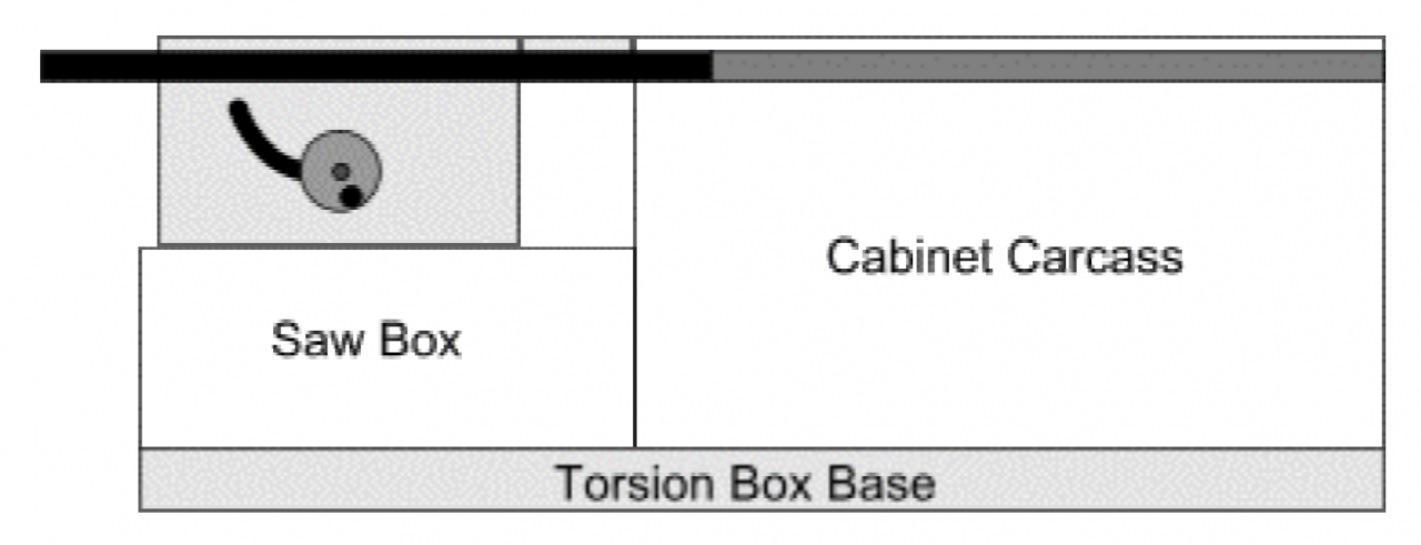 The whole cabinet should be built on a torsion box base for maximum stability. Any flexing, or twisting (either front-to-back or side-to-side) will affect the set-up and alignment of the saw, rails and fence and could render the whole project un-useable. Many have found that minor problems with cutting disappeared once they had made sure that their BT3K was set up level on its stand and the use of a torsion box base removes such problems permanently.