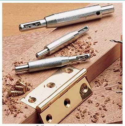 I have seen the so called VIX-type bits that have a spring loaded tapered nose that fits into the hole in the hardware to center the bit, as you push the nose retracts and the bit centered in the holder drills the exact center since it is guided and cannot bend, it enters precisely in the center of the hole in the hardware, effectively using the hardware as an exact template. They feature replaceable bits held with an Allen set screw and come in a variety of sizes ranging from #3 to #10 screws. The slots in the sides of the nose piece are for cuttings ejection.