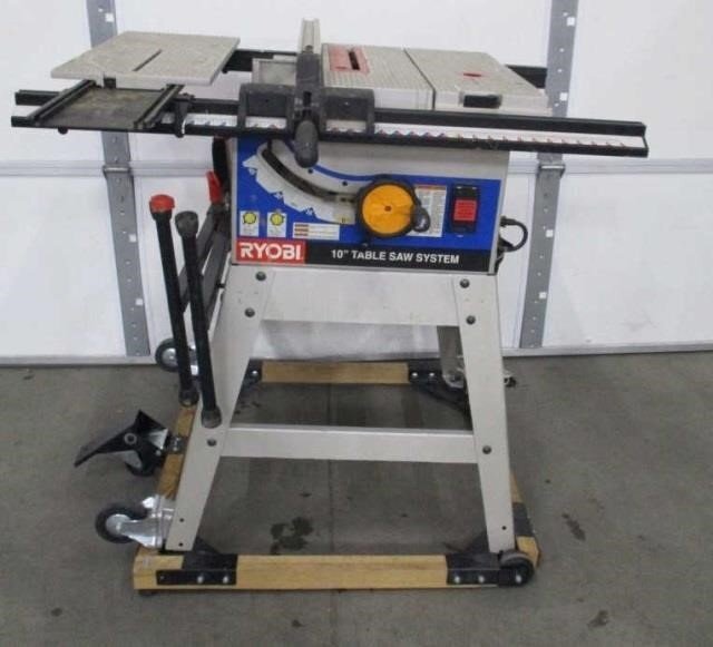 splayed gray stand, Red ryobi logo and 10" Table Saw System on the black and bottom and blue trim on the face. The yellow and black elevation handle. The black sliding miter table base.& black rails