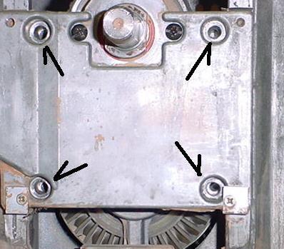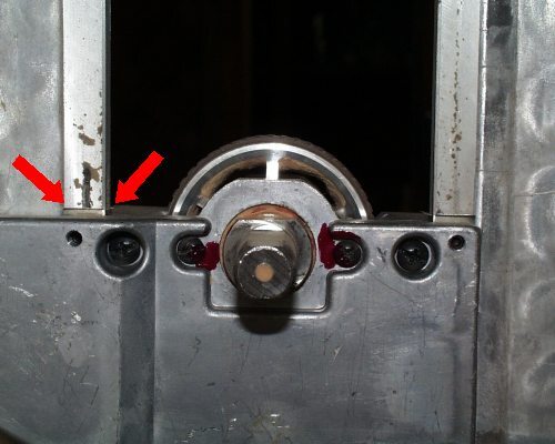 This is the BT3000 with the blade removed looking at the end of the arbor and the bracket that slides the motor assembly up and down to raise the blade. The red shows the tops of the shims they have a little fold over that keeps them in place. You can see them if you raise the blade and peer behind the blade with a flashlight. After you get the saw keep the area clean and paste wax the two vertical ways you see here that they ride on. Wax all three sides of the ways and on both sides of the opening.