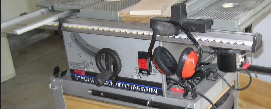 the sliding miter table sliding base is the giveaway; the square stand and the red Ryobi logo and "BT3000" in the lower left, in the black strip that says 10" PRECISION WOODCUTTING SYSTEM in three languages on the right and the red switch and the recognizable closed black elevation handle. Silver rails
