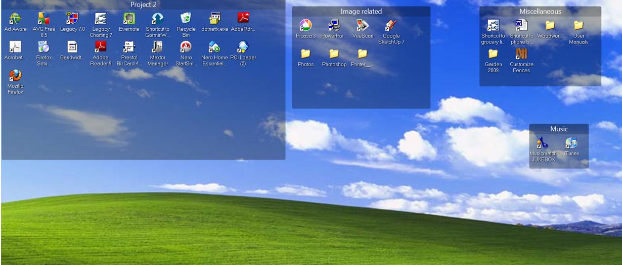 Check out this free software http://www.stardock.com/products/fences/ . It allows you to put "fences" on your desktop, to keep things uncluttered. You can make as many as you want. Here's a screenshot of my desktop. Click on image to see it larger.