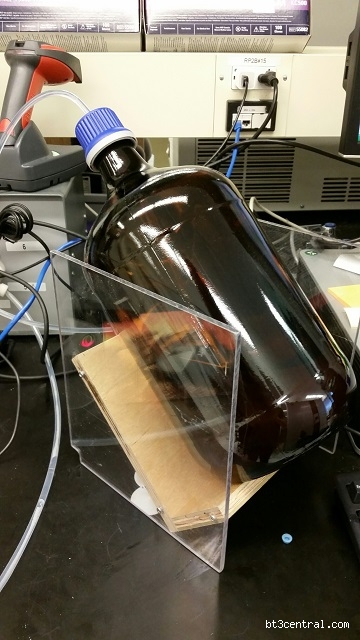 Before I made the cradle, we'd prop the bottle at an angle against a box. After it slipped a couple of times (one time shattering the bottle) and always spilling reagent everywhere (one bottle costs $400) and causing a huge mess, I started making these. The clear sides let us monitor the reagent level. The first one had just one clear side because it is against a wall.