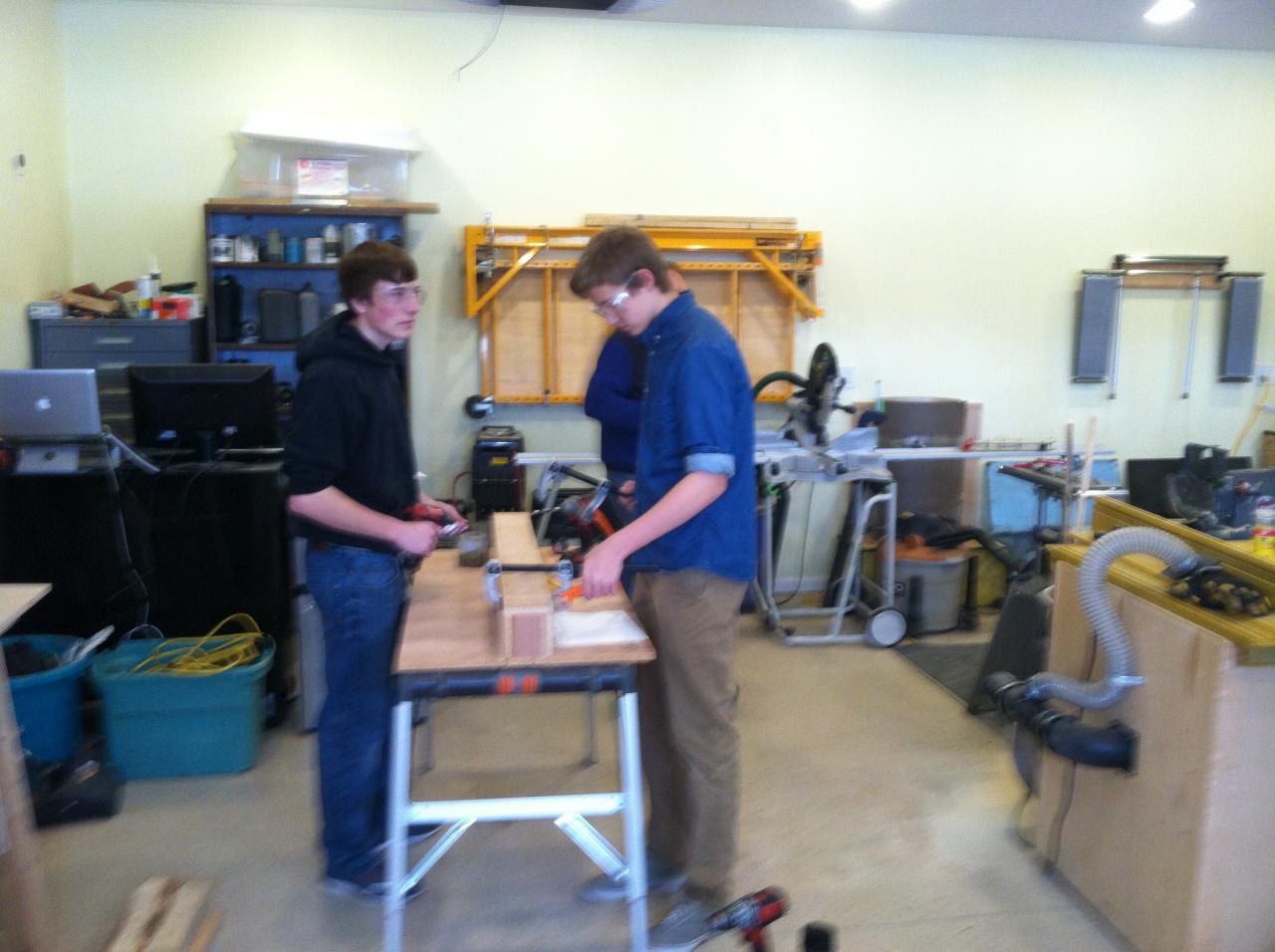 Last weekend the high school robotics team needed a wood shop in order to build some practice obstacles for their upcoming challenge. We started the morning with a safety briefing and got to work with materials donated by a local cabinet shop. The kids built a teeter totter, a rough terrain, mote, a berm, and a base to mount the obstacles.