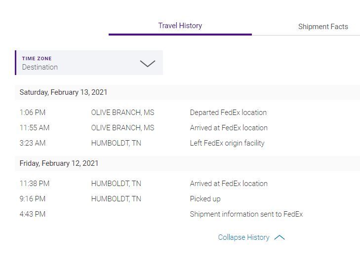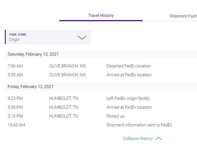 According to the destination report it was picked up at the same time but took six hours more getting to the FedEx location. According to their destination travel report this 6 hour difference puts it, arriving and departing the Olive Branch, MS location this afternoon, 3 hours 40 minutes and 4 hours 51 minutes, respectively, after the report was printed! (If my math is correct)