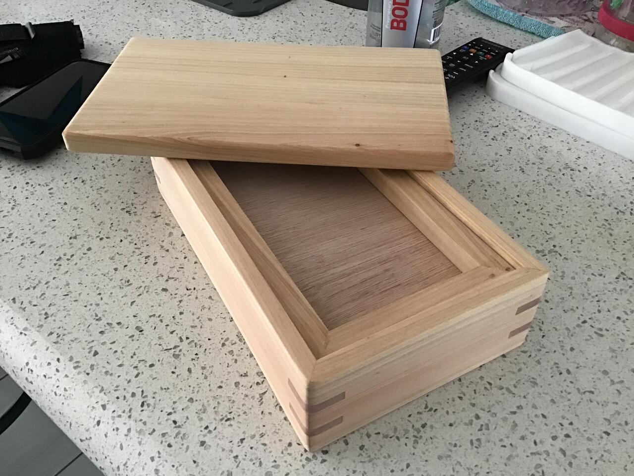 Not exactly construction lumber but it was inspired by the whole Challenge thing. I found a 5/4 thick by 5” piece of cypress that I had misplaced awhile back. The box is 6”x10” and 3” tall. The bottom or the box and tray are 3/16” birch ply. It’s still a work in progress. I’m bouncing back and forth between polyurethane and spray can lacquer. Need advice on that one. Then hinges. I think I’ll splurge for the nicer ones . Click image for larger version