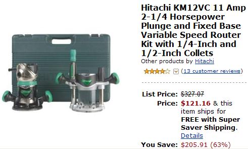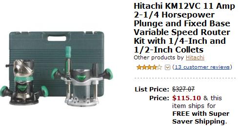 Hitachi KM12VC 11 Amp 2-1/4 Horsepower Plunge and Fixed Base Variable Speed Router Kit with 1/4-Inch and 1/2-Inch Collets $121.16 Ships Free