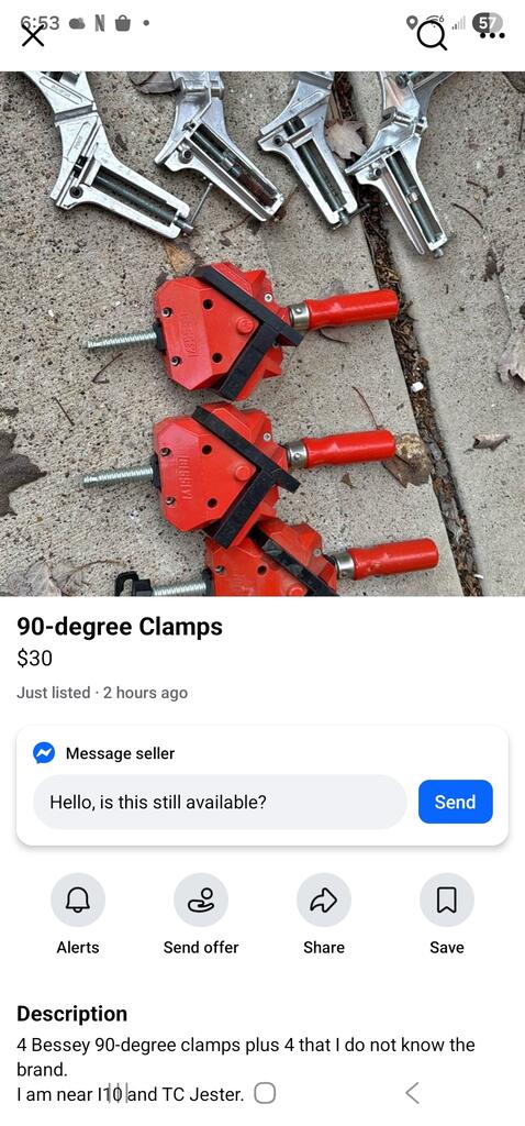 In central Houston (I-10 and TC Jester), four Bessey 90° miter clamps plus four no name cheapies.