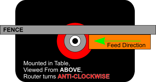 Situation: The bit turns counterclockwise, half of the bit is hidden by the fence, (the fence is covering most of the bit) you want to ALWAYS feed against the direction of the turning bit. Safe