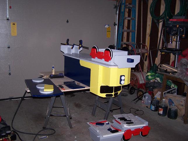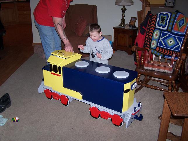 Here's the latest projct I completed. It is a toy box for Granson Logan. It seems that he has more and more junk ('scuse me, treasures) piling up in our computer room. He loves Thomas the Train, so when I saw plans for this I got them. After all, it only took 1 1/2 sheets of plywood, so how hard could it be??? LOTS of parts to cut out! That's the problem I'm having right now, is trying to cut along the line. Most of the parts seemed to come out ok, but there were a few that didn't match the pattern exactly. The only thing I haven't done yet is put on hinges for the top, don't know if I will or not. It might be more flexible with the top free, more room to pile toys up...