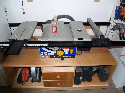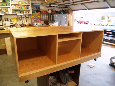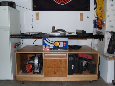 The first project I made was this Mobile cabinet. I started with a torsion box, then for the cabinet used biscuits to add strength to the joints. I've used biscuits to assemble a prior project and it worked well. The center dividers were spaced to place the BT mount bolts outside the vertical dividers. This gave me a decent size for the drawers and space to route out the middle for my dust collection bin. I made the cab plenty deep to prevent the saw from tipping when cutting large boards like my old Craftsman would. This had the benefit of adding weight to the unit for stabilty. Seems to work well. I am adding leveler feet to the sides and am looking to add a router station and table top. Any comments or ideas would be appreciated.