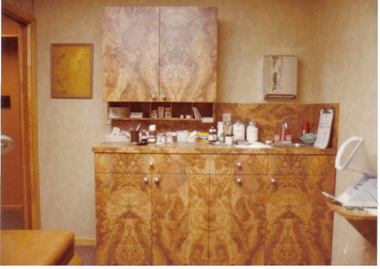 These cabinets were part of several exam rooms and were done in a patterned mica. What was so unique about them is if you really look at the matched pattern across the face of the base and upper cabinet what do you see? This was totally unplanned.