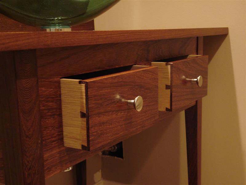 I made the drawers last because they required the most guts: I hand-cut the half-blind dovetails. They’re not perfect, but I’m happy with them . The sides, bottom, and back are made from 0.5” white oak. The back is dadoed into the sides.