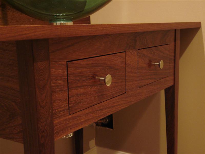So here’s Phase 1 of my Second Floor Bath Project. The primary wood is panga panga and the secondary wood is white oak.