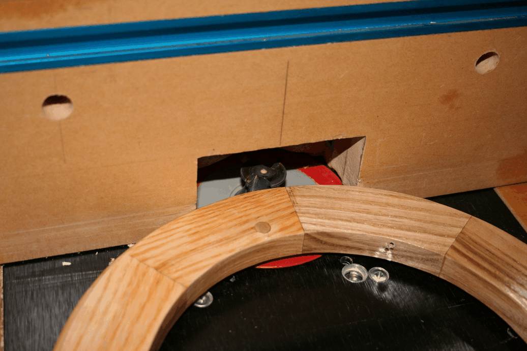 Then the task that I was nervious about, routing the recess inside for the clock, and the profile outside. I effectively did climb-cuts to prevent tearout, and show the process below. The first pic shows routing the recess in the inner circle, keeping the piece against the fence for support. The next shows the cabinet door profile that I put on the outside, and how I buried the bit in my router fence, about 1/4" (from 1/2" to 1/4" in several passes), and use the large fence opening as guides for the workpiece. Just rotated it through, keeping it firm against both corners in the fence opening.Last edited by jgrobler; 04-23-2007, 10:47 AM.Comment