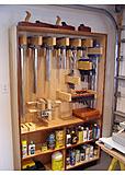 Birch plywood carcass with jatoba edging, rubbed on tung oil finish. The finish/flammables storage is temporary - a storage cabinet will be added as soon as I can get a bit more floor space cleared up.