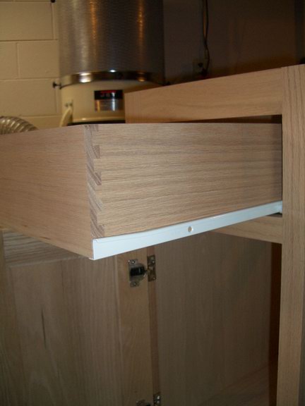 I finally completed a base kitchen cabinet. It's the result of taking a cabinet making class at Woodcraft. I still need to route some kind of profile on the drawer front and attach it to the drawer. I was thinking of a cove since the raised panel is a cove profile. Any other ideas. Now I just need to get going on the real kitchen cabinets.
