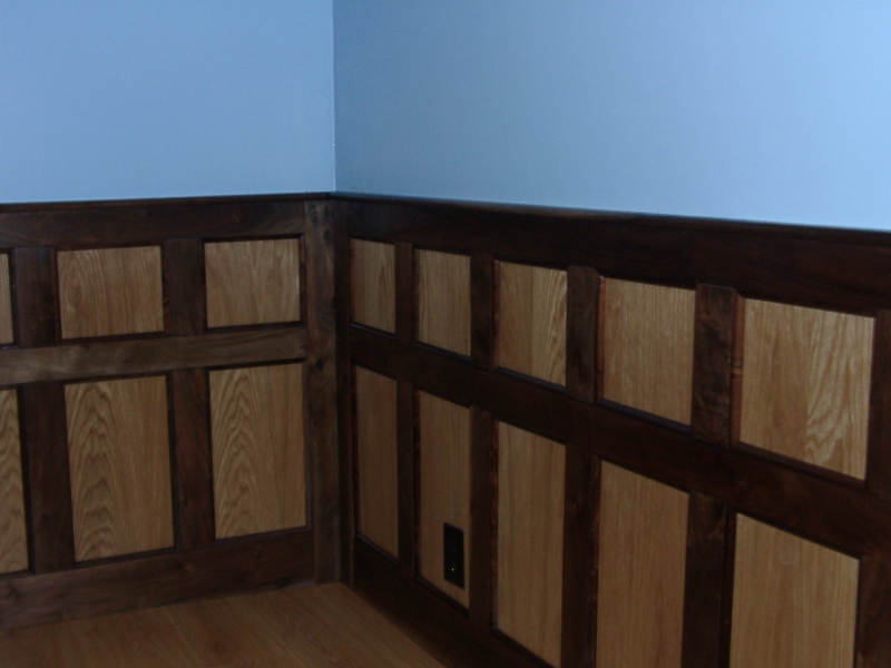 I found an article in Woodworkers Journal a couple of years ago on Wainscoting. I did the walls and built a custom bookcase to match. I used walnut and white oak plywood throughout. Everything was finished with at least two coats of brush on Deft lacquer. If my math is correct I did 468 miter cuts on the trim of the wainscoting. This is the first project I have posted so I hope the pictures show up. I wanted to post a few more pics, but my camera went dead.