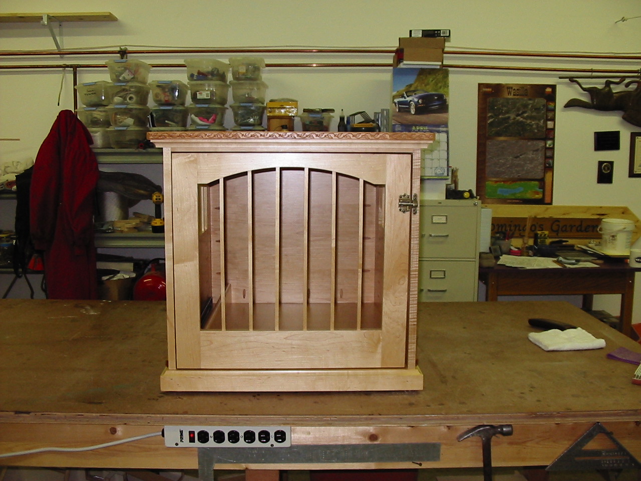 LOML wanted a dog kennel for our 2 doxies for the house. Then door slides inside the case. Used hard maple and 6 coats of a wipe I made myself. Then 4 coats of satin poly. It just got moved into the house.