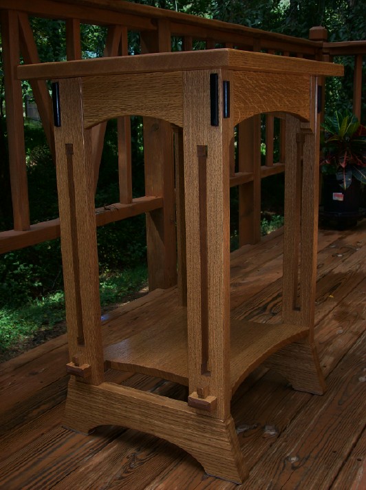 The piece is QSWO with 90% darker heart-wood left over from 3 other recent projects. Gaboon ebony accents. All joinery was mortice and tenon.. bridles.. through tenons with no screws except for top fasteners. My design all the way so I have to take responsibility for however the results might be judged.