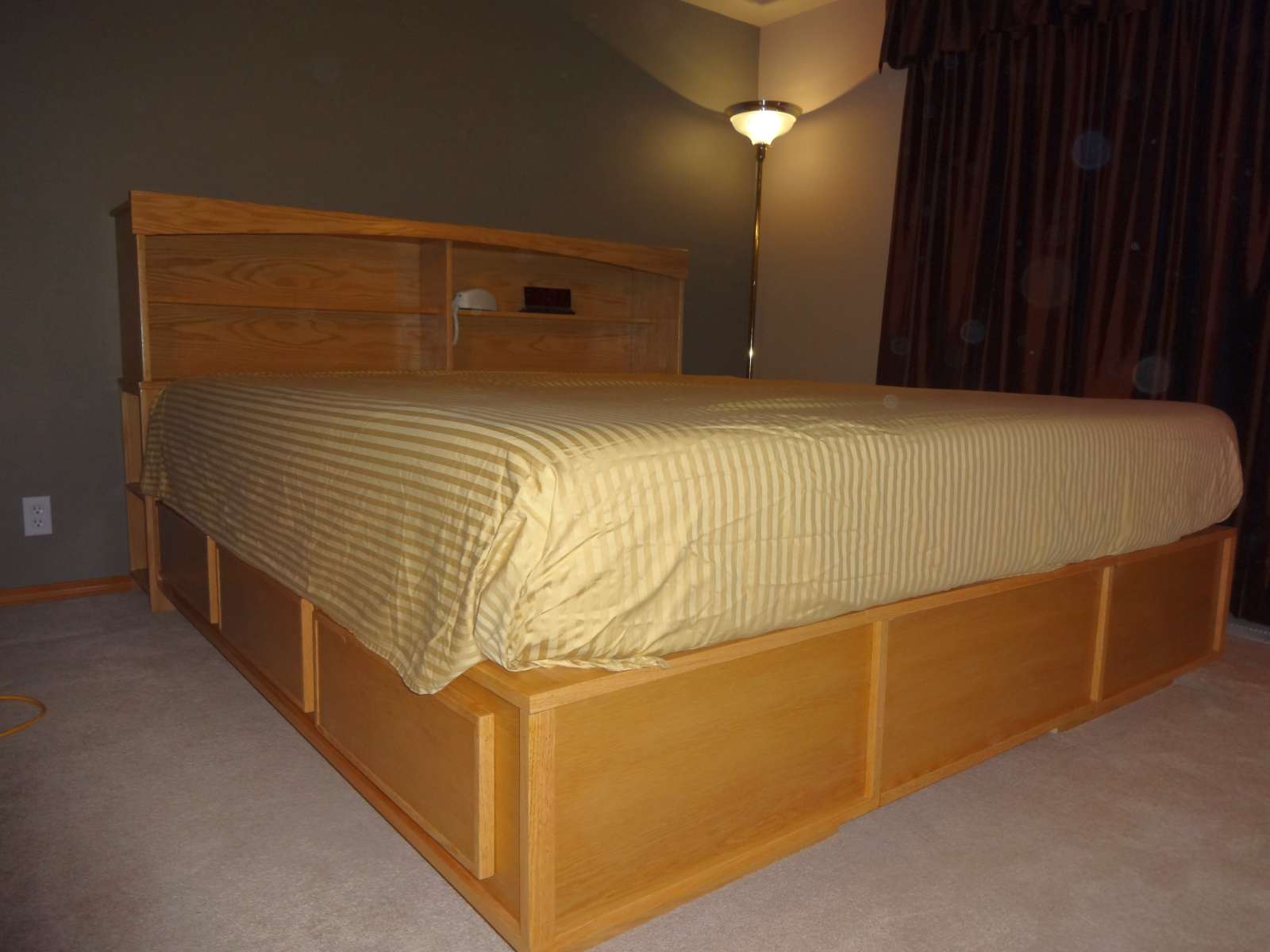 A King size pedestal frame and headboard. Designed and built by me using oak veneer plywood and red oak trim. I was originally going to trim it in walnut but the price and quality of walnut available to me scared me off.