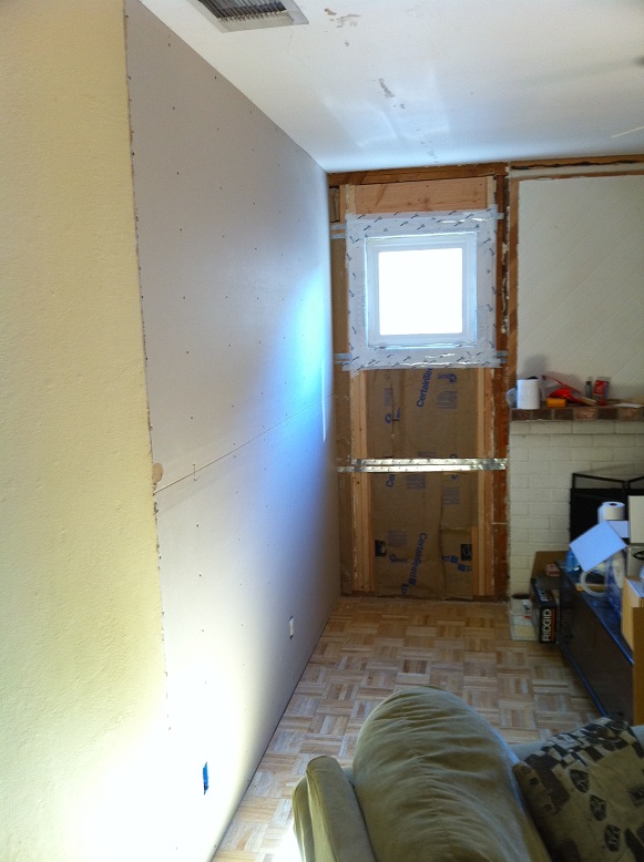 So the idea was to close off the cove area and move the washer and dryer to the new area. It sounds simple but it required me to build a false wall in order to route all the plumbing (I guess I could have routed it through the existing structure but with the drain pipe it would have meant cutting a lot of material out of the 2x4's and could have affected the structure). So I built a wall and added windows (3 of them, 1 for the laundry room and two picture windows for the living room).