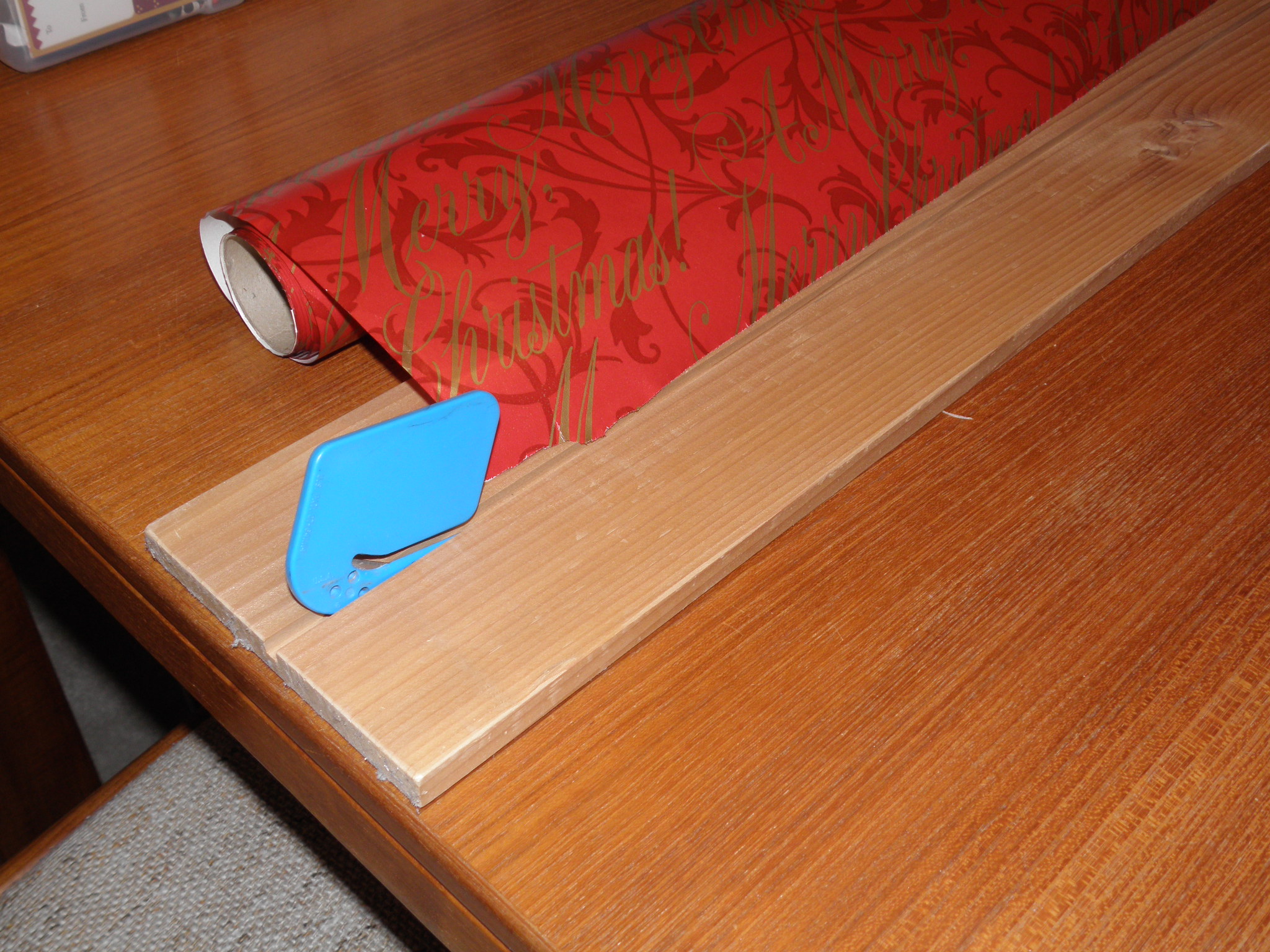 It's a cutting guide for christmas paper wrap. The problem is always cutting wrap square and clean. Usually I'd use scissors and the cut would not be straight or smooth and often wandered way off square. This device solves that problem.