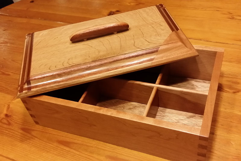This second box incorporates cherry, white oak, mahogany and a little maple (in the handle). I did experiment a little with the inlaid mahogany and fell foul of some bad chip out in the white oak, hence the featured cherry corner :-) Not sure I will try the same thing again.