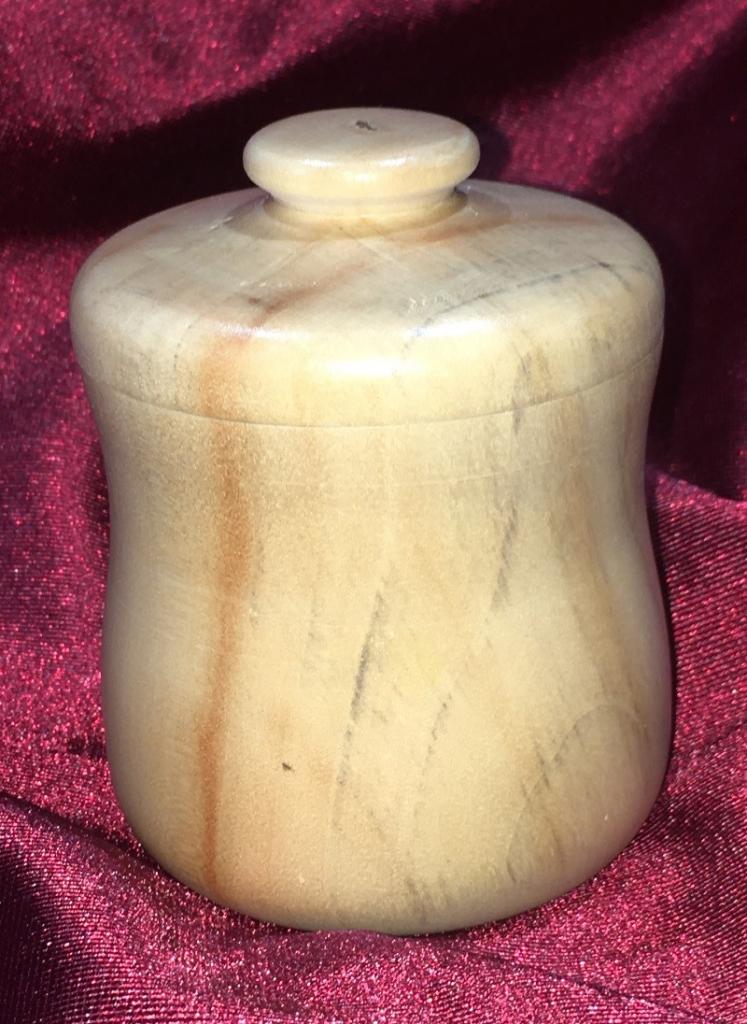 This small cup was intended to be a mini urn for some of the ashes form her dad and step mom. Turned from Box Elder and drilled with a forstner bit but I screwed up. I used the wrong bit and drilled it too big for the lid to fit snug so she uses it to keep her rings when she takes them off. I'll pick up another turning block and make the urn later.