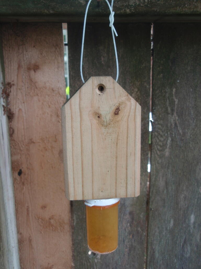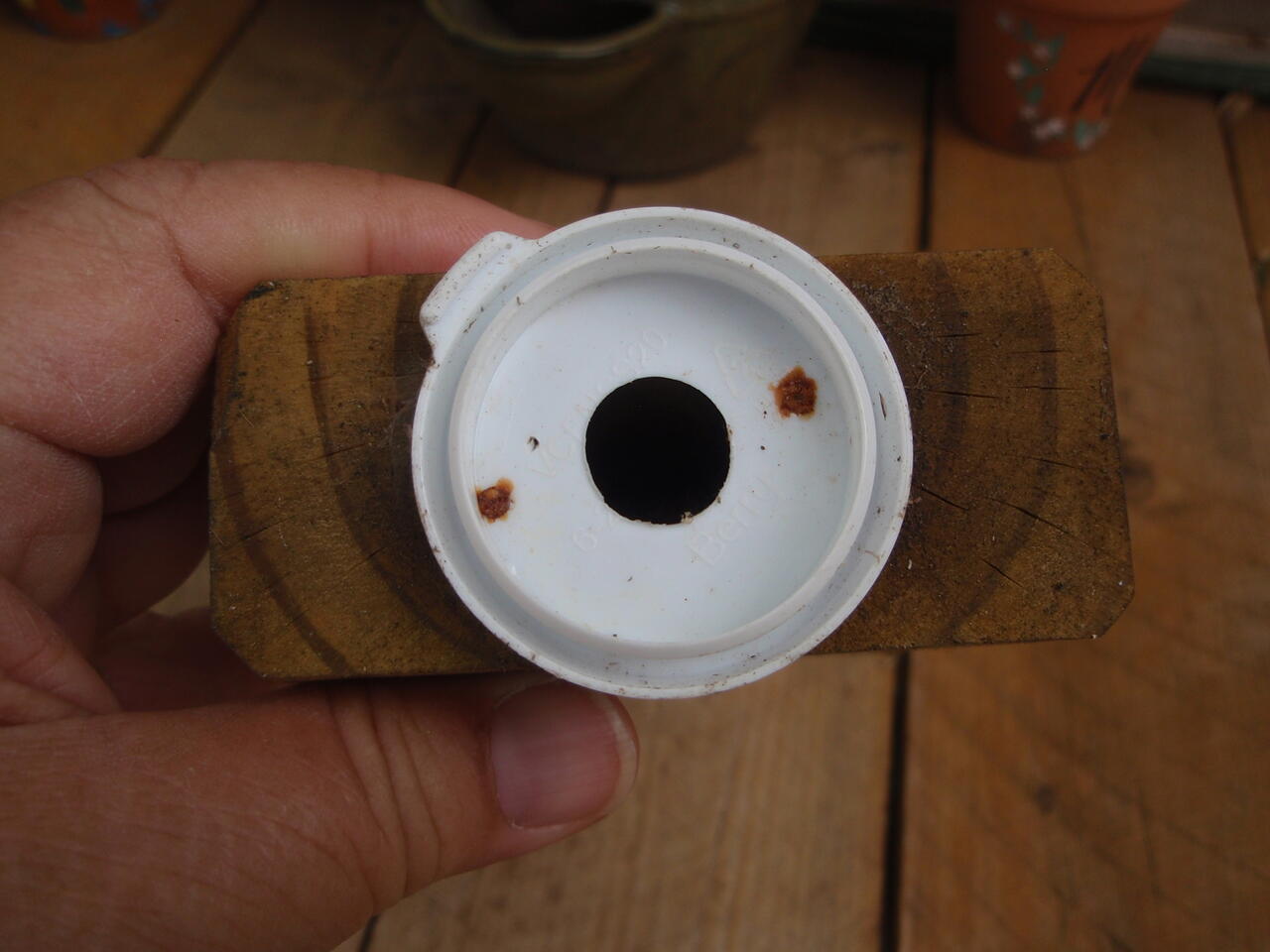 - Take a small clear see-thru plastic pill bottle and drill a 1/2" hole in the center of the plastic cap. Mount the cap centered over the 3/4" hole in the bottom. I used two small brad nails but I imagine small screws or some hot melt adhesive or other adhesive will work well. I use a bead of hot melt glue to prevent hard rain from leaking into the bottle. I found that glass jars with screw lids would work but the glass caused condensation to form on the glass every morning and it accumulated water over time in the jar, a bit of a mess.