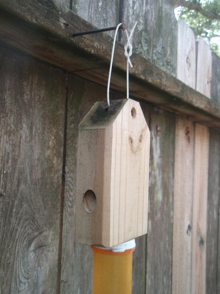 Here I simplified it even further to use a single piece of 2x4 5-3/8" long. I made mine of treated pine,pretty much any wood will do. I know that carpenter bees don't mind treated pine because they have bored into the TP rails of my fence.