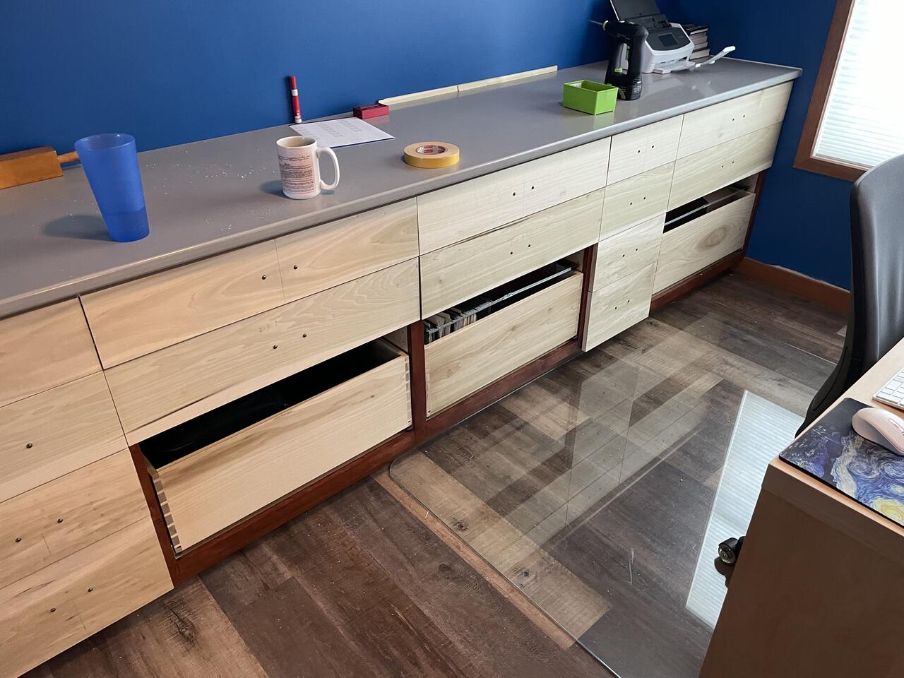 Still to do, is to finish the base cabinets behind my desk and build the upper bookcases for those.