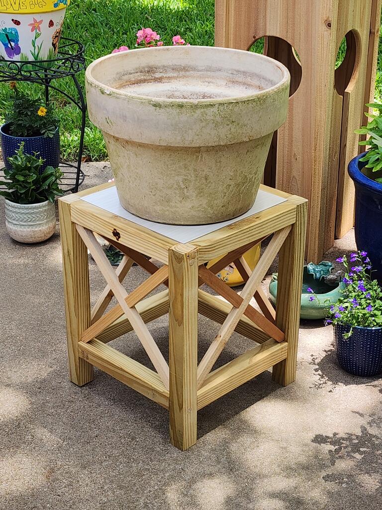 Made another planter stand, This one from treated pine 2x4 ripped to 2x2 and using pocket screws. And a ceramic floor tile sample rabbeted into the top.