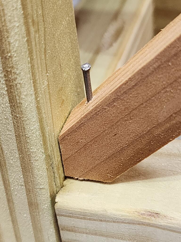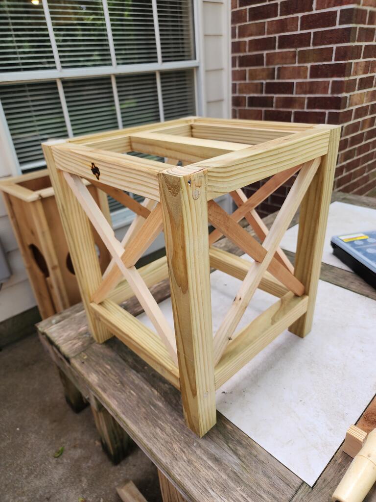 The frame was quite strong, the braces I added for decorative reasons, from cedar strips. The frame was pretty easy, the strips proved a real bear. I half lapped the crossovers. Fastening to the frame was tough because the narrow space, closing angle to toe-nail them was impossible to get a hammer in there and the sloping wood makes entry of the nails difficult..