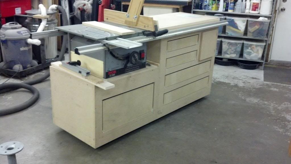 table saw cart (not finished, but has vacuum, power, drawers, router area)