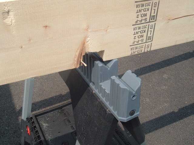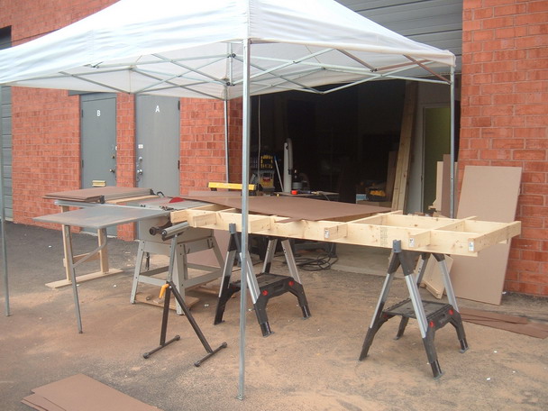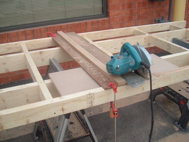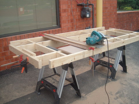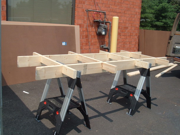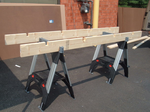 It starts out with a pair of saw horses bought at the Borg. These work well for this because they have notches on the top that accept a 2x? and each leg is adjustable so if you're working on a slight incline as we were for this project you can level the table out.