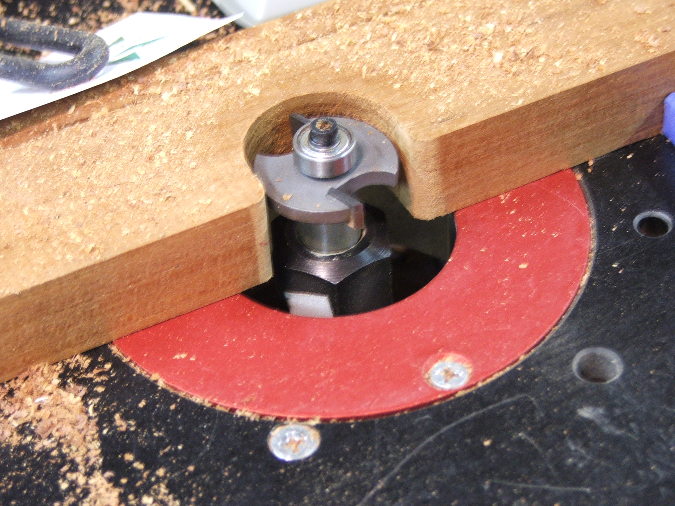 here's my current router fence. Nothing fancy as you can see. Just a planed and jointed hardwood (Jatoba, I think) board, two quickgrip clamps (one at each end), and a offset hole drilled near the center. A hole at one end to hang it.