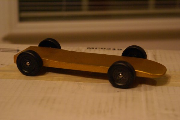 The winning car (mine - ) was the simple wedge. I spent a lot of time making sure the axles were free of burrs and highly polished (I even went so far as to polish them in the direction of rotation for each wheel - probably more voodoo than actual measurable benefit). There were other cars that had been optimized via computational fluid dynamics with the body subsequently machined to shape - but the standard wedge still came out on top.