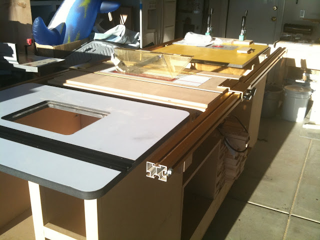 The BT3100 rails are attached because they provide a convenient way to mount my router table. Unfortunately it's 32x24 and won't fit within the Incra rails unless I buy the wide saw table kit for another $60 or so. Then I could make the base 32 inches deep and get rid of the BT3100 rails altogether (might be a good idea actually). I'd like to keep the router table oriented and located where it is, so I can use the Incra fence more easily. Currently I have it on the far left of the rails and I have to switch the who fence/positioner around any time I switch between router and table saw. That gets old fast.