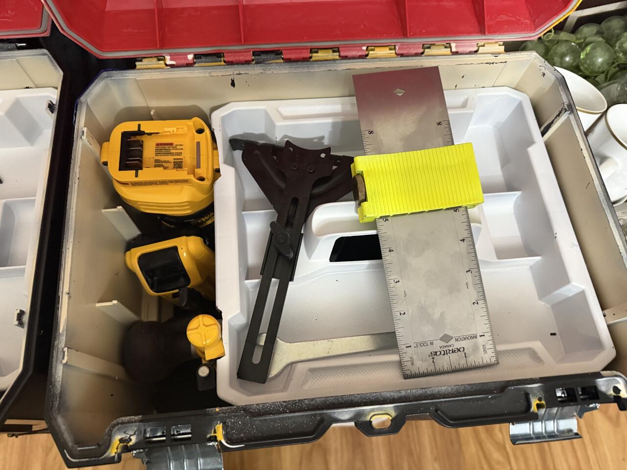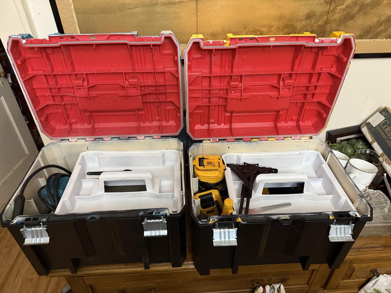 I wanted to spot them easily so I bought the nearest spray paint that would correspond to DeWalt and Makita and painted the outside top. I did paint the inside a light beige because I hate hunting for small items inside a black box.