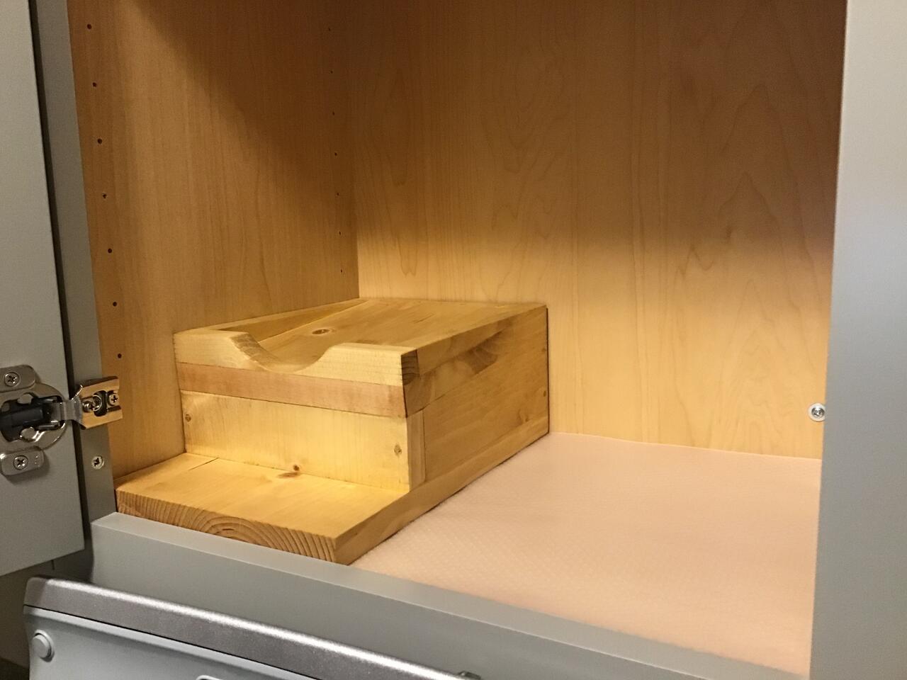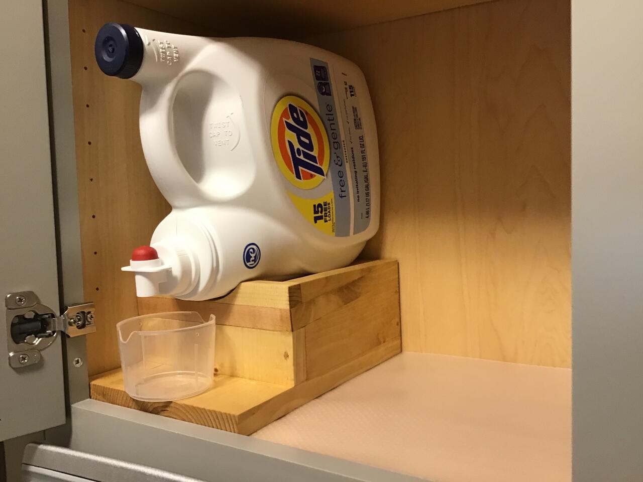 The laundry room remodel placed the big jug of laundry soap up in a cupboard and SWMBO wanted a stand to raise the jug up so the measuring cup could be placed under the dispensing spout without having to pull the jug out of the cupboard. So I cobbled up a design using some pine scraps from the shop. Then I checked the Google for "laundry soap jug stand" and discovered there are quite a few commercially made ones being sold online. Interesting enough, they all looked pretty much like the one I drew up. So the question is do I spend $13-$30 for a commercially made one, or do I spend a dozen hours in the shop making one? So 8 hours spread over five days later, the laundry soap jug stand is done. The finish is three applications of Watco Danish oil and one application of Minwax satin polyurethane wipe on. I was aiming to match the interior finish of the cabinet. If I were to do this over, I would certainly design the construction differently, but I was using some 12"x1" pine shelving scraps left over from a shop shelf build some years ago and was sort of in a hurry.