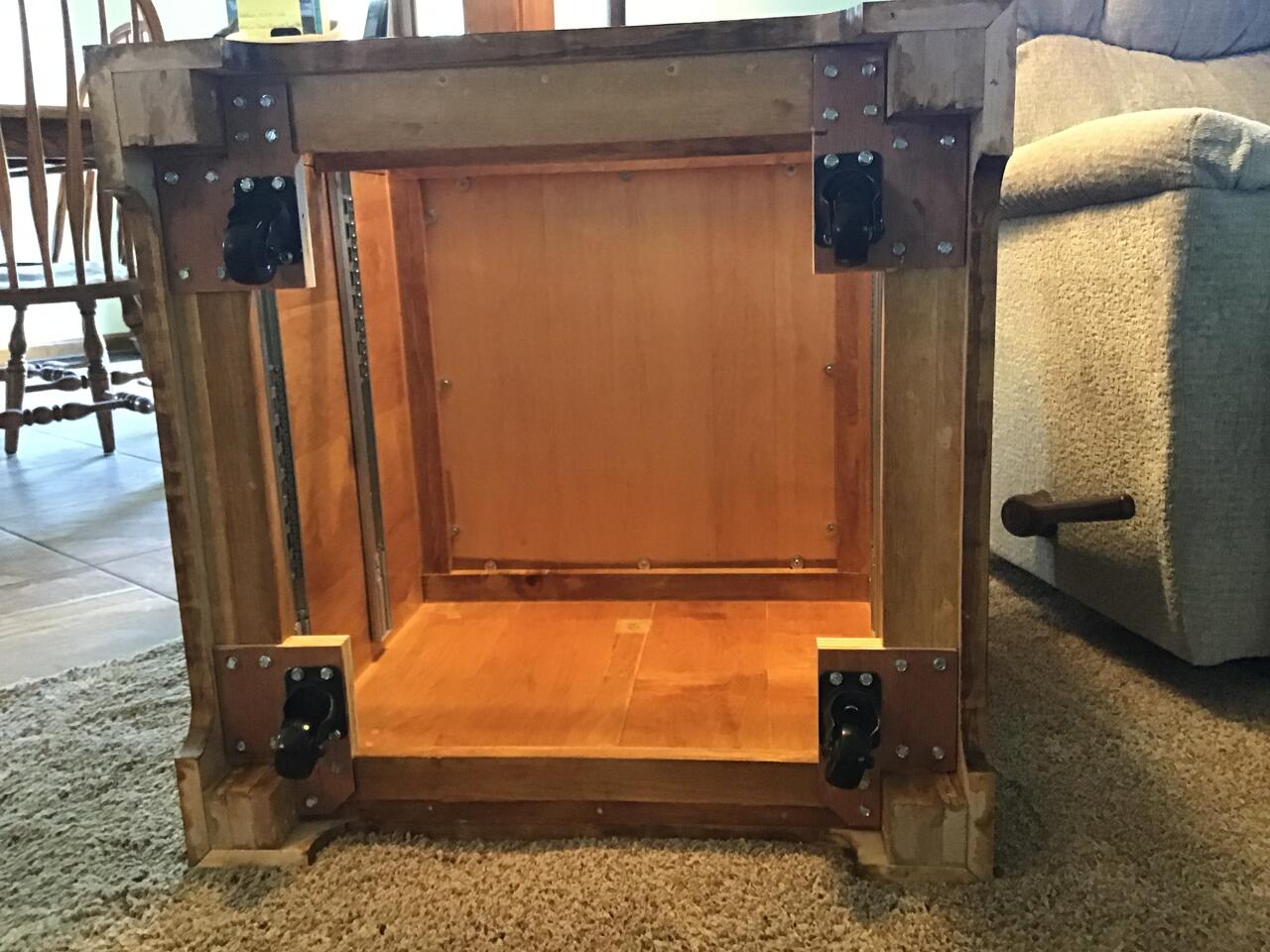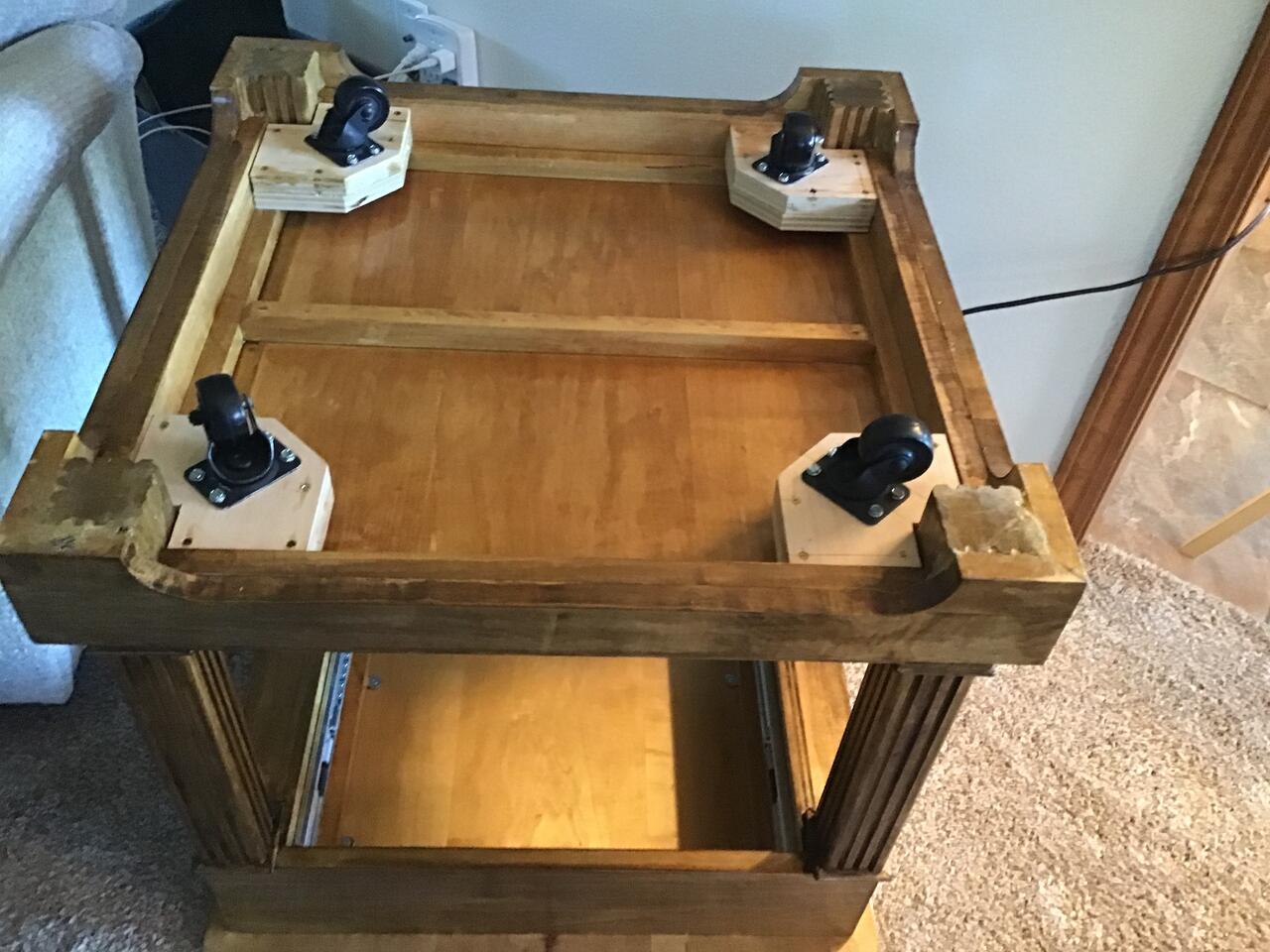 Second table. The underside of this table was done a bit differently and required a different solution to get the casters at the proper level. I had to make a thin plywood mount with a 3/4" piece behind it to mount the caster. The 3/4" piece was glued to the carcass frame rails in the corner. Everything was attached with #12 hex head self tapping screws in predrilled pilot holes