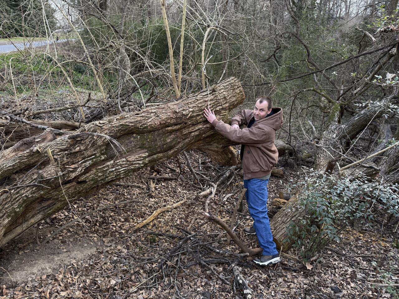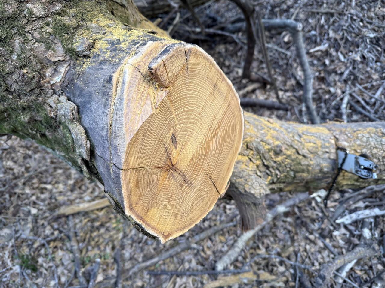 A church member and young friend (in his early 30's) asked me around Christmas time if I wanted some oak, at least he thought it was oak. He tried to cut it with his saw but was inexperienced with how to cut without pinching. He tore up his 16" chainsaw and the blade is still in the cut on the log. Last Saturday while at his house for a few minutes to pick him and his wife up to go eat out with LOML and me, he said, come look at this tree down in a creek about 50 yards from their house. As we started down in the creek, I noticed yellow chainsaw dust and got excited. Then I saw the yellow face of two cuts he had made. I got REAL excited at this point. He said I could have it if I teach him how to cut with a chain saw safely.
