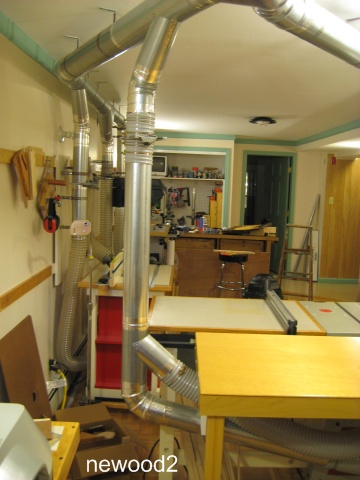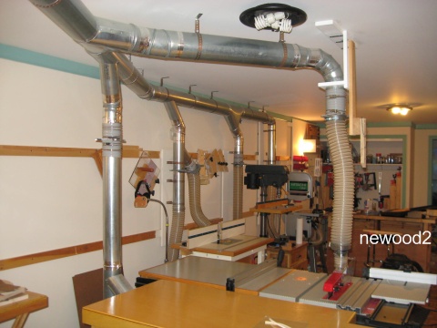 #1. Run the duct along the ceiling, and drop to the tool, with the blast gate about halfway down the wall, transitioning to flex hose. The biggest problem I see there is getting to the table saw. How do I deal with getting to the underside of the saw?